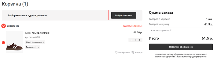 1. Выберите наиболее удобный магазин, в котором есть товар в наличии, нажав на кнопку «Выбрать магазин» в разделе «Выбор магазина, адреса доставки» Корзины.