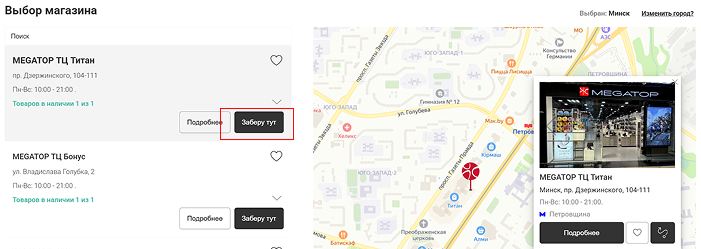 3. В процессе оформления заказа в Корзине в графе «Способ получения» выберите магазин, из предложенного Списком или На карте, подтвердите свой выбор, нажав на кнопку "Заберу тут".