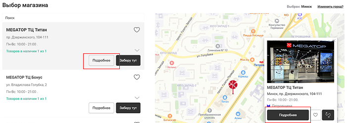 2. Ознакомьтесь с информацией о времени и режиме работы магазина, нажав на кнопку "Подробнее" слева в предложенном списке либо пройдите на страницу с более подробной информацией о работе данного магазина, нажав на кнопку "Подробнее", расположенной справа. Подтвердите свой выбор кликом.