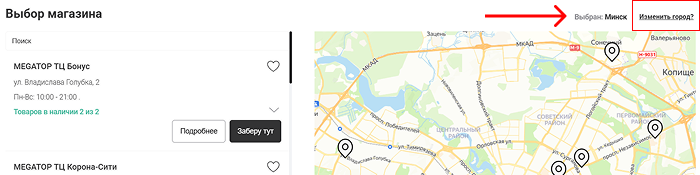 5. Так же, при необходимости, в разделе "Выбор магазина" можно выбрать другой город, нажав на "Изменить город?" в верхнем правом углу и в предложенном списке выбрать нужный город.